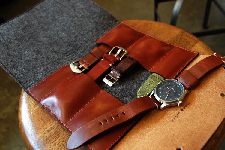 Matching Horween leather watch wallet to hold 4 watches, extra strap and strap tool