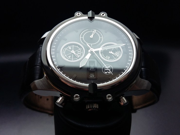 The base movement is Swiss origin (Valjoux 7750), after few modifications, settings and decoration “in-house” the accuracy and self winding is strongly improved.