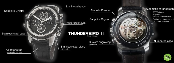 All of the Thunderbird II automatic chronographs are produced in France. The mechanical movement is “Swiss made” based on a Valjoux 7750 which is decorated, modified and cased in the workshop. This offers collectors a superior accuracy and better automatic winding system. Once the movement is hand assembled and passes a stringent test it will then qualify for the Mikael Bourgeois standard of excellence and hermetically sealed in the case of the Thunderbird II.