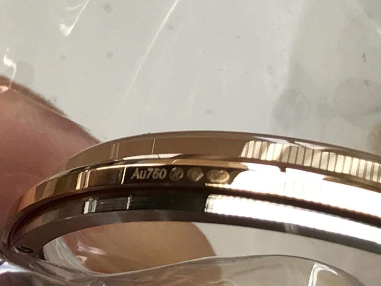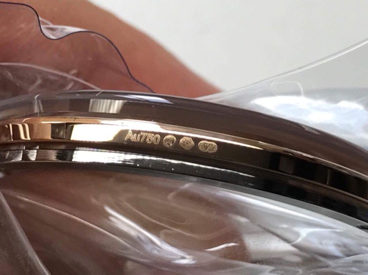 The Hallmark is swiss and means that certain parts are gold, and the purity mark next to it tells you the fineness – in this instance we know that Sebastian’s used 18k gold.