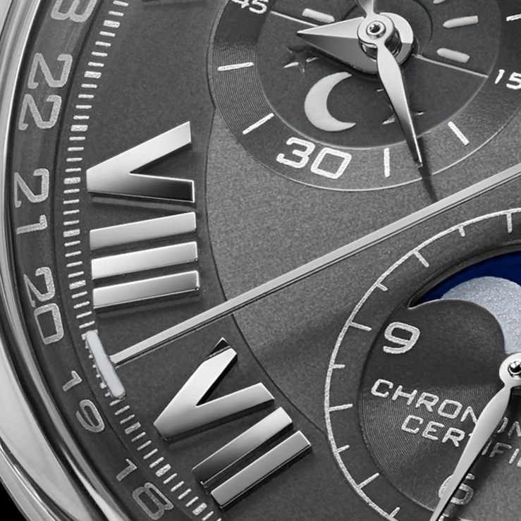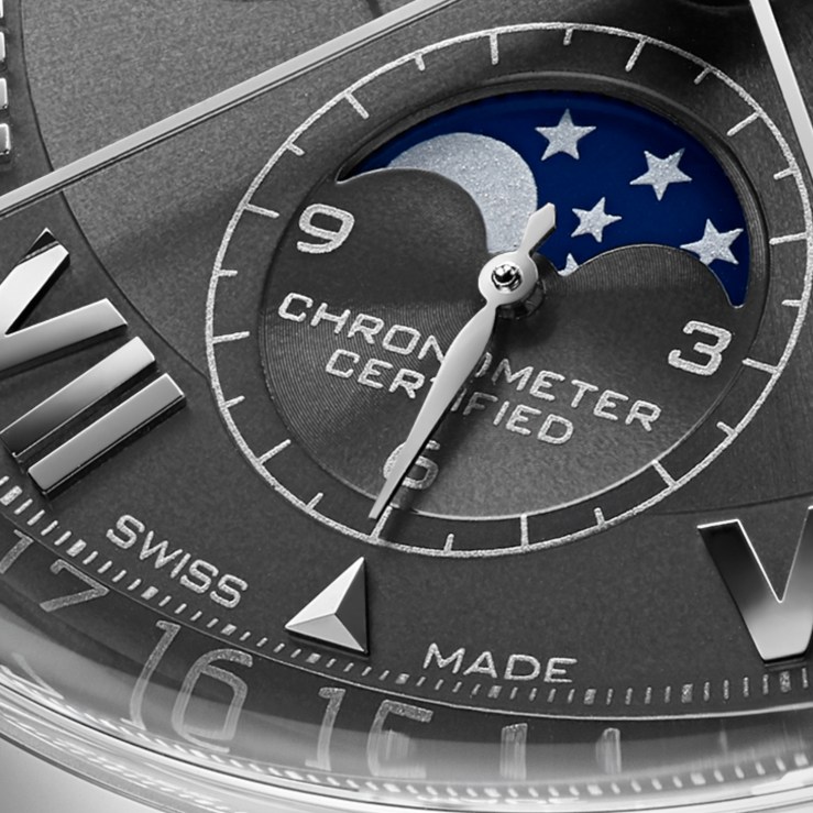 The iconic collection of the brand is now enriched with a new limited edition that will delight collectors eager for new complications. In addition to the chronograph, the anthracite dial features the triple calendar functions with date, day and month, the day / night indicator and the moon phase display feature. For the first time we feature the use of roman numerals.