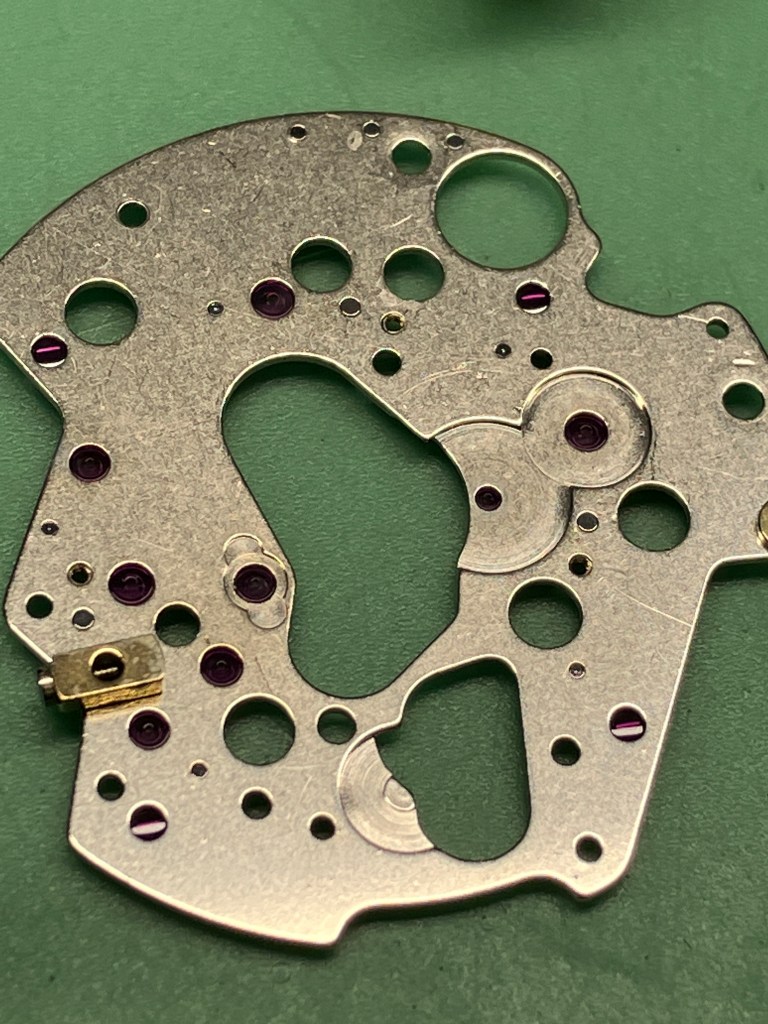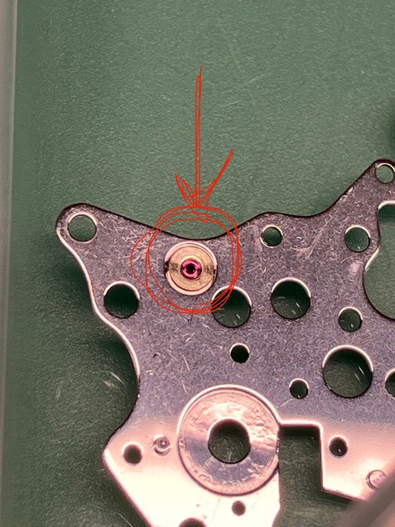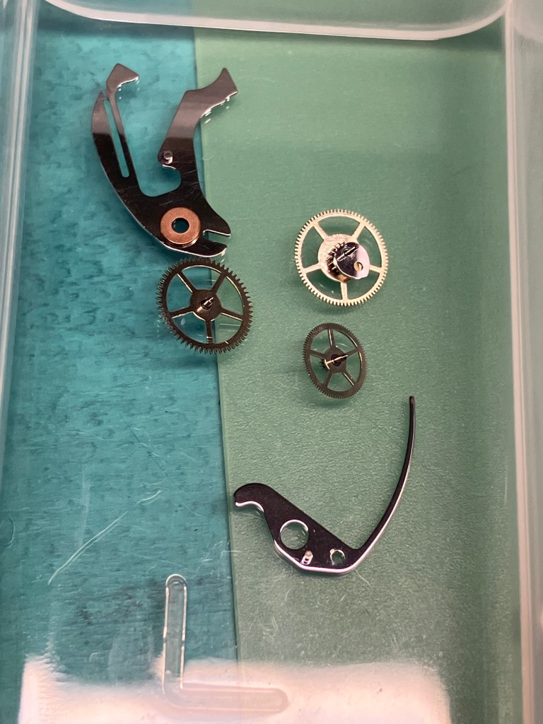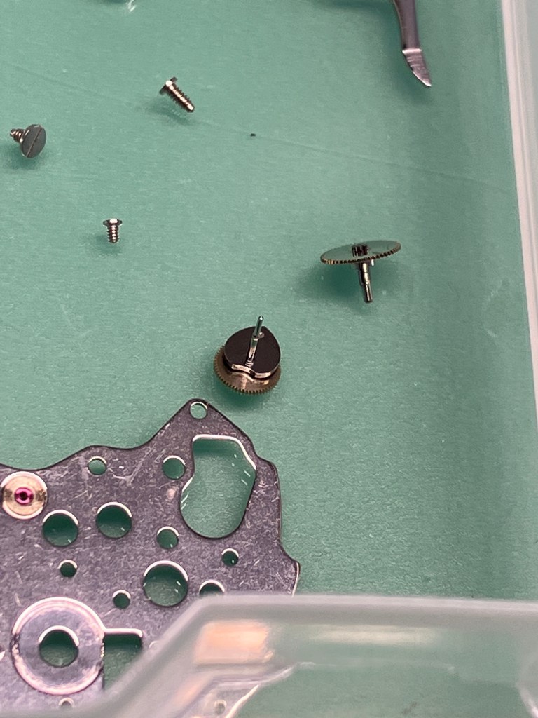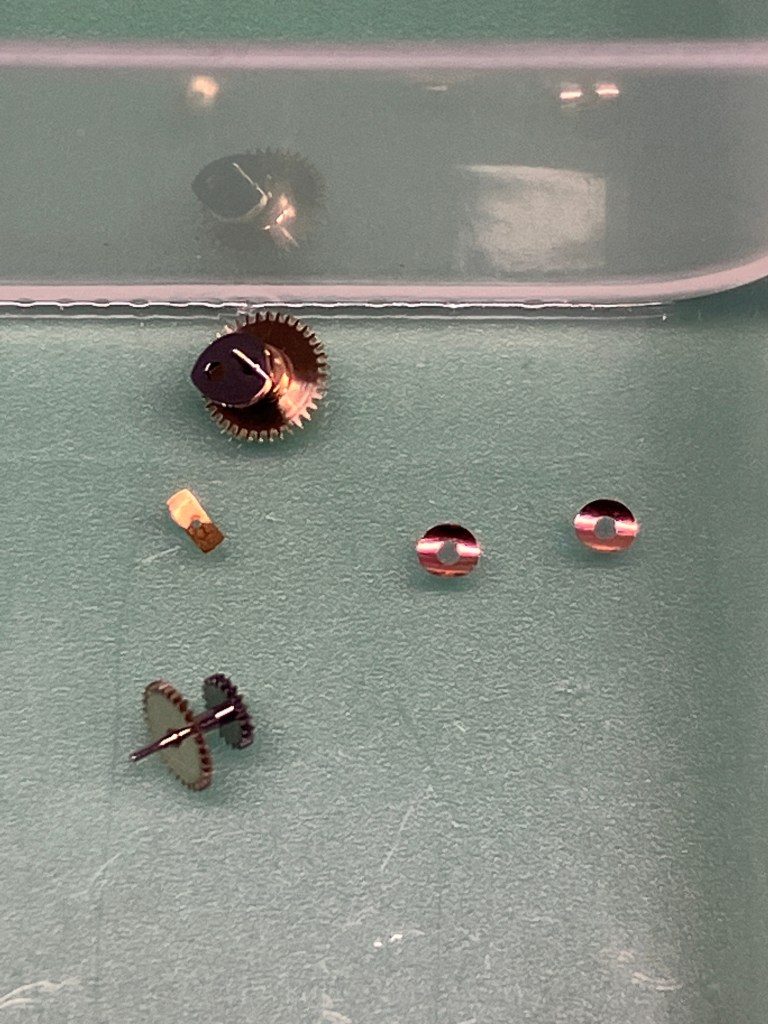 I have circled things to note and look for, small thrust washers, a spring, and a push fit wheel on the driving wheel. The push fit wheel comes apart quite easily from the slot it sits in and needs to be removed to be completely dismantled.